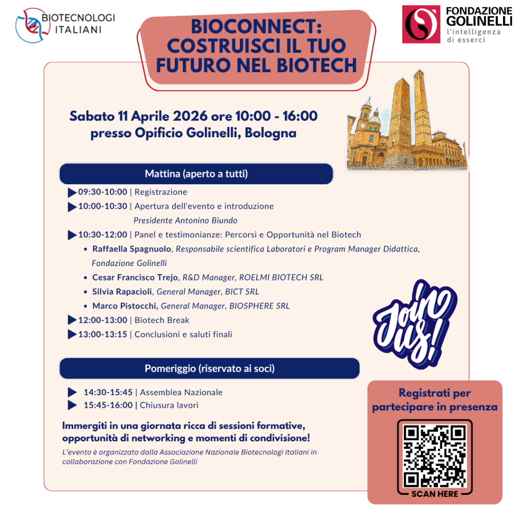BioConnect è l’evento promosso da Biotecnologi Italiani con il patrocinio di Fondazione Golinelli per riunire #professionisti, #studenti, #ricercatori e #aziende del mondo #biotech.